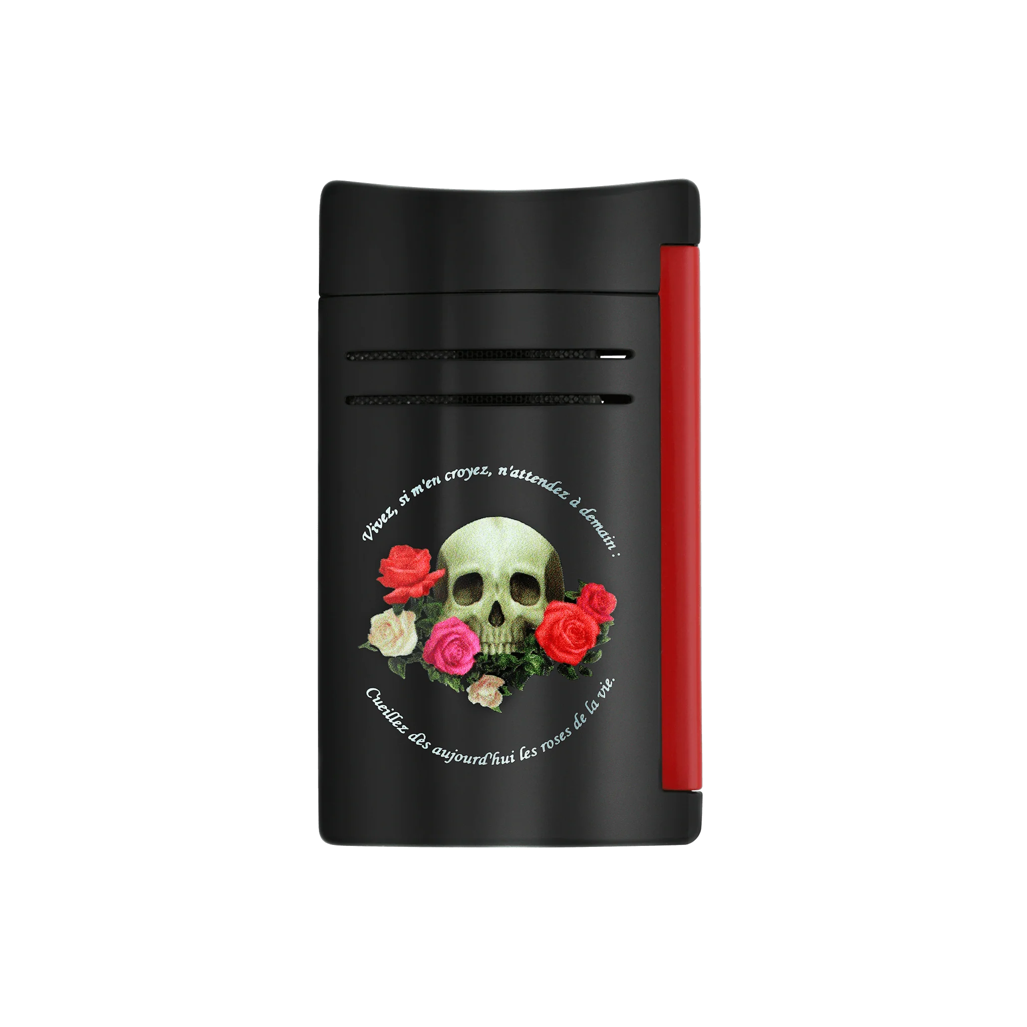 The S.T. Dupont Maxijet Memento Mori is part of the evocative Memento Mori limited collection — a memento of life’s fleeting preciousness. S.T. Dupont’s powerful pocket torch lighter is adorned with the Memento Mori pattern in glossy black and red lacquer, delivering both bold aesthetics and a strong torch flame.