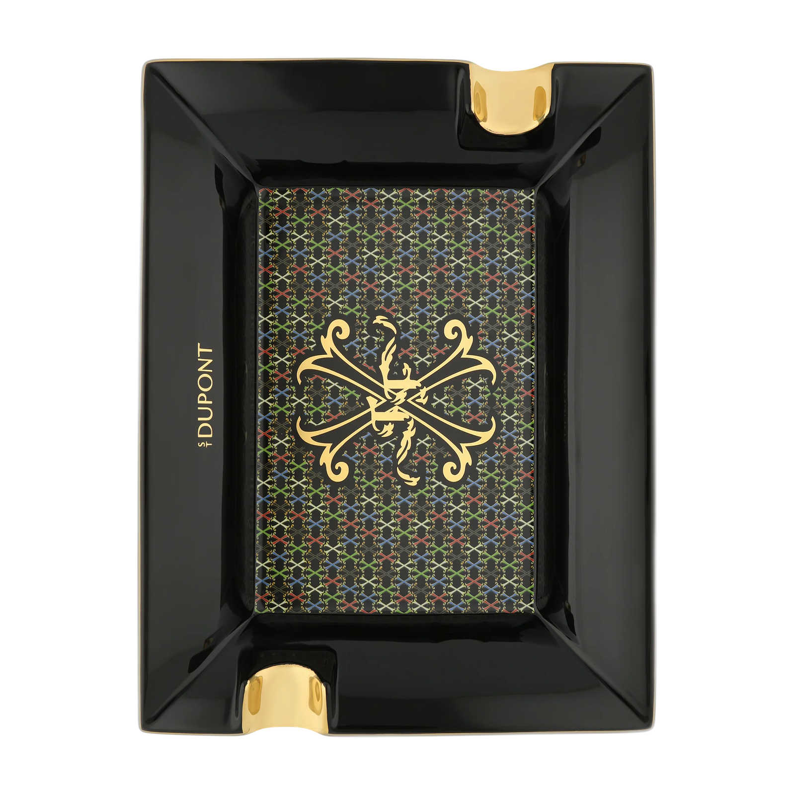 Ashtray – Black lacquer decorated with the multicolor X monogram and Opus X Fuente crest at the center. Hand-painted gold finishes on the grooves.