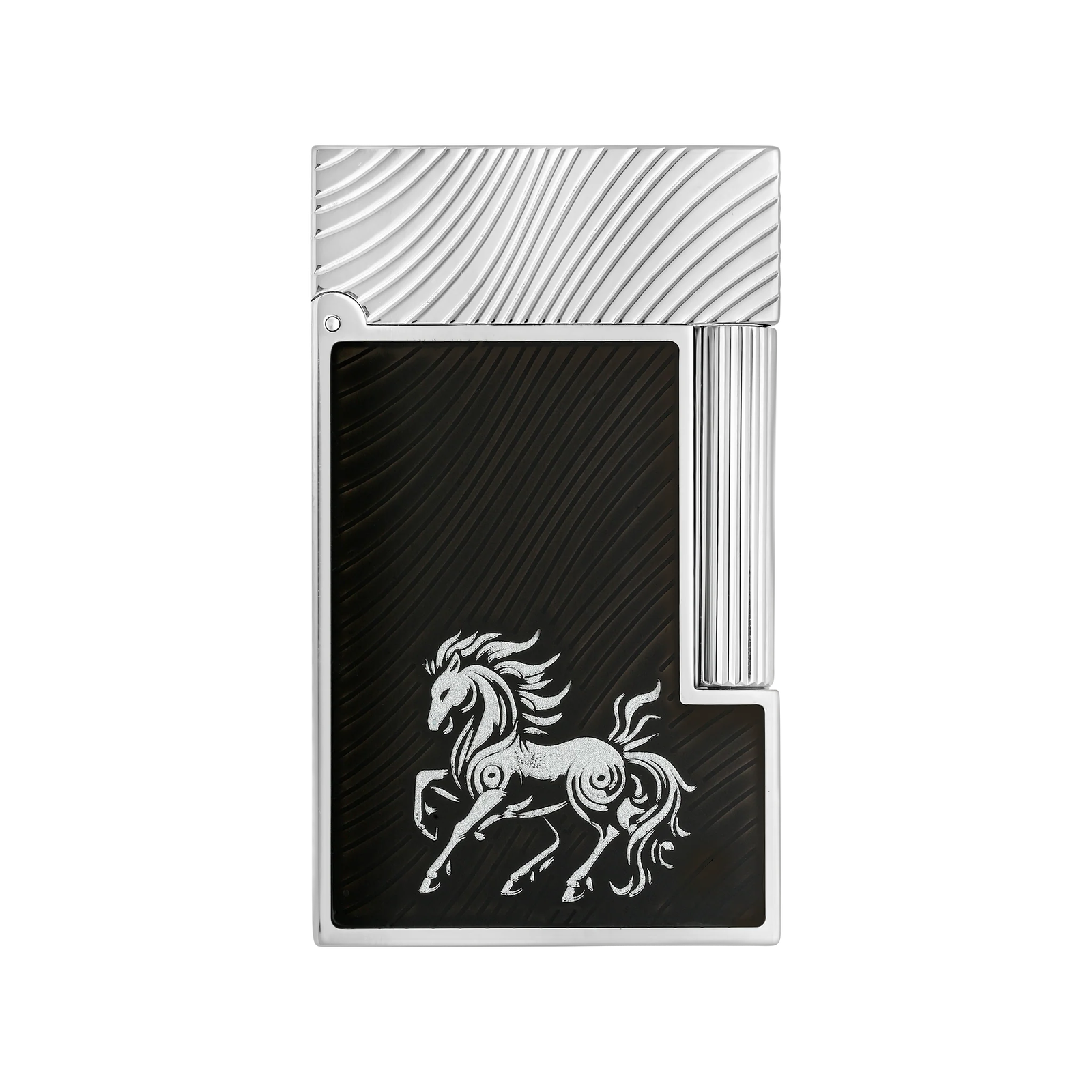 Inspired by the 2026 Lunar Year of the Horse, the Horse Mane Collection introduces a unique “mane” guilloche under red or black lacquer. Ligne 2 Cling lighter decorated with guilloé under high-gloss black lacquer with “horse mane” motif. Gold-plated finish. Equipped with a double yellow flame and the signature “Cling” opening. Lighter delivered empty of gas; refill sold separately.