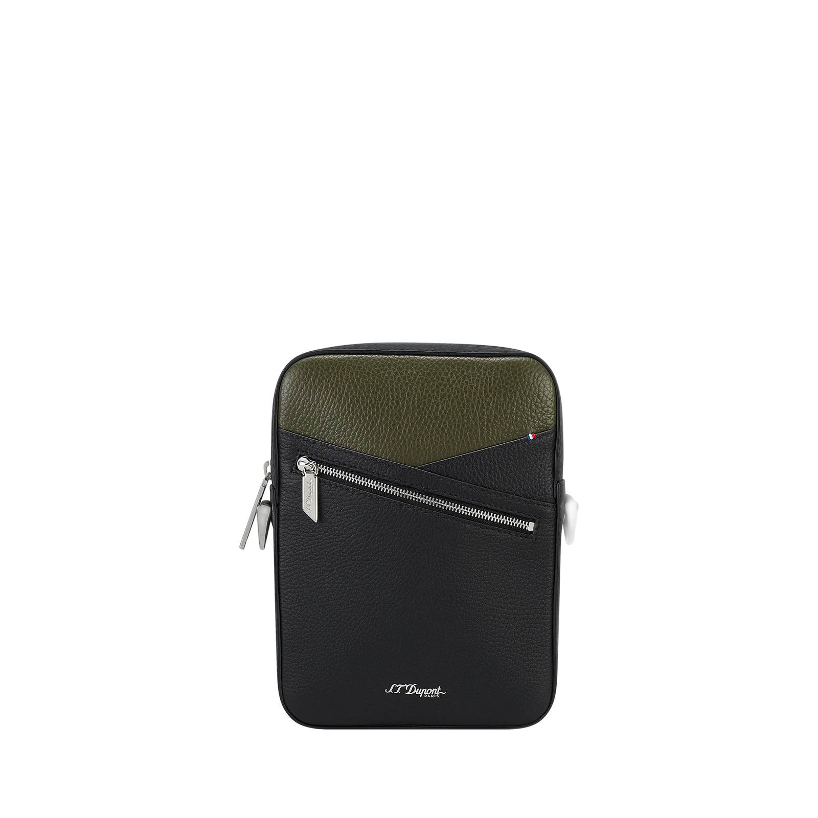 Compact but spacious enough to hold all the essentials, the khaki and black two-tone bag can be worn over the shoulder with its adjustable strap. Made from full-grain calf leather, it has a pocket at the front and inside the bag. All products from the Nรฉo capsule collection are certified LWG – 1 zippered pocket at the front of the bag, – 1 flat pocket.